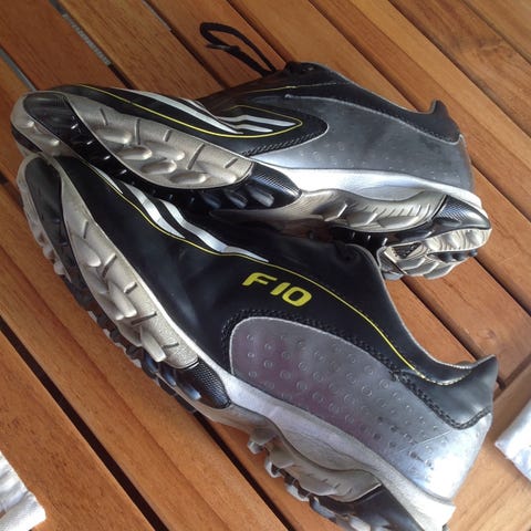 Kengät ehjät, mutta ulkonäkö on tekonurmesta saanut vähän väriä
