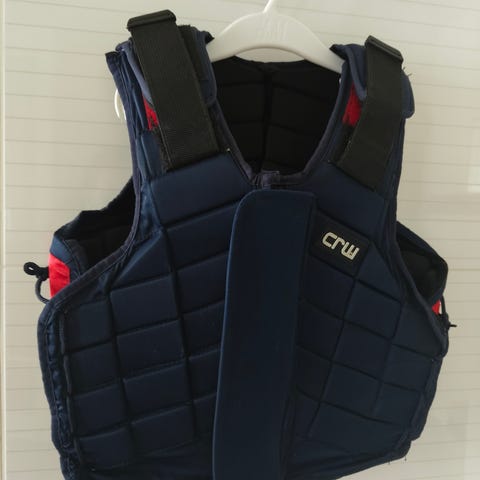 Käytettykuntoinen, mutta toimiva ratsastusturvaliivi noin 7-9-vuotiaalle. Sivuilla nyörit säätöä varten. CRW kokoa 8. Musta.