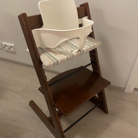 Myydään valkoinen Stokke Tripp Trapp -syöttötuoli ja babyset. Muutamia pieniä klommoja, mutta siisti ja täysin ehjä.