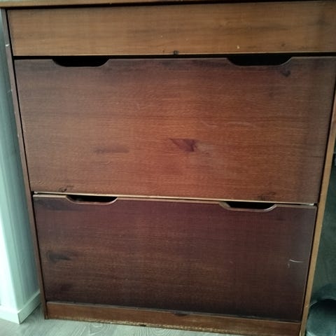 Kätevä kenkien säilytykseen. Kengät saa pystyyn telineeseen. Ollut 58 vm syvässä ja 97 cm leveässä kaapissa. Telineessä on kiskot joten on ulosvedettävä.