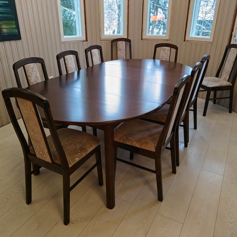Ensiluokkaisessa kunnossa olevat Laitalan tähkäempire tuolit sekä pöytä halkaisijaltaan 1m