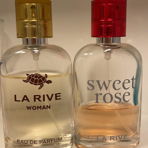 La Rive Parfum. Hajuvesi, jossa on vaaleanpunainen neste ja kirkas suorakulmainen pullo hopeanvärisellä suuttimella. Vähän käytetty.
