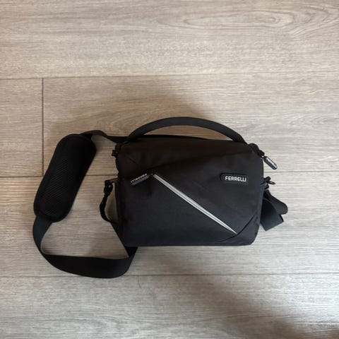 Lähes uudenveroisessa kunnossa oleva tyylikäs Ferrelli olkalaukku, laukussa ei ole muokattavaa sisustaa, mutta sinne mahtuu järjestelmäkamera linssin kanssa ja pientä tarviketta sisätaskuihin tai vaihtoehtoisesti esim Sonyn RX10 IV.