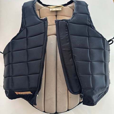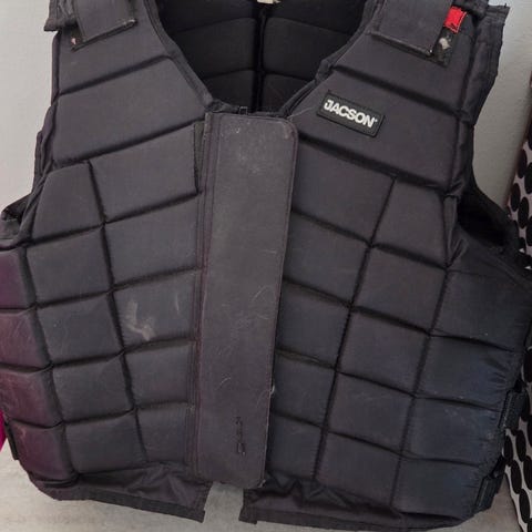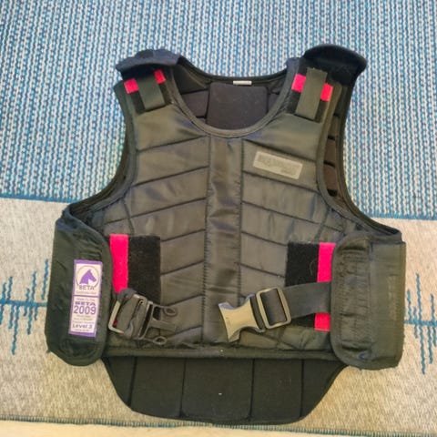 Käytetty lasten S-kokoinen ratsastusliivi. Musta. Vetoketju. Molemmilla sivuilla kiristystarrat. Nouto.