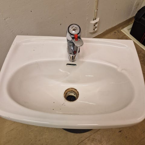 Oras pesuallas valkoisella pinnalla ja integroidulla viemäriliitännällä. Sopii kylpyhuoneen tai vessan pesualtaaksi.