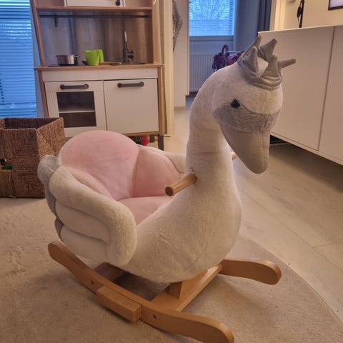 Keinujoutsen hyvässä kunnossa, ei näkyviä tahroja. Molemmille puolilla maalattu nimi "Emmi".