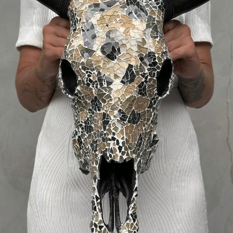 Lasin peittämä naudan kallon.Kallo on kokonaan koristeltu käsin suurella huolella.Se on epätavallinen, koristeellinen esine.Noinmiten mitatPituus: 52 cmLeveys: 52 cmHUOM:Yksi tai useampi kuva esittää tyyliteltyä esinettä. Tarkat tiedot myytävästä esineestä löytyvät muista kuvista. Tyylitellyssä kuvassa olevat esineet eivät sisälly myyntiin.Olemme lisänneet kuvia käsityöläisistämme työssään antaaksemme kuvan siitä, miltä mosaiikkikuoren luomisen prosessi näyttää.Paino, joka mainitaan, sisältää pakkausmateriaalin.VastuuvapauslausekkeetSarvet irrotetaan kuljetuksen ajaksi, ja ne on helppo kiinnittää uudelleen.Myös kallon yhteydessä on kiristysnaru, jonka avulla sen voi kiinnittää seinälle.- Sarvet ovat aina laatikon pohjalla, kallon alla. Varmistathan, että poistat sarvet ennen pakkauksen hävittämistä.- Koska kyseessä on luonnollinen kallo, siinä saattaa olla joitakin luonnollisia pieniä halkeamia, uurteita tai puuttuvia hampaita. Tämä on normaalia. Katso kuvat viitteeksi.- Kallomme puhdistetaan ammattilaisvoimin, mutta joskus hampaissa voi esiintyä pieniä värimuutoksia. Tämä on luonnollista ja normaalia, eikä siihen voida paljoa vaikuttaa. Katso kuvat ohjeiden tueksi.LähetysKohde lähetetään seurantanumerolla DHL Parcelin, DPD:n tai postNlin kautta. Seuranta päivittyy Catawiki-luettelossasi, kun pakettisi on jätetty postiin.Ole hyvä ja tarkista säännöllisesti välttääksesi pakettisi palautumisen meille, jolloin ostaja vastaa toisen lähetyksen toimituskuluista.Seurantaan Espanjaan ja Portugaliin käytä tätä linkkiä ja lisää Catawiki-erästäsi saatu seurantanumero.https://clientesparcel.dhl.es/LiveTracking/HomeME EMME YHDISTÄ TOIMITUKSIA!!!Jos sinulla on kysyttävää paketistasi, ota meihin yhteyttä Catawiki-viestipalvelun kautta. Pyrimme vastaamaan kolmessa työpäivässä.