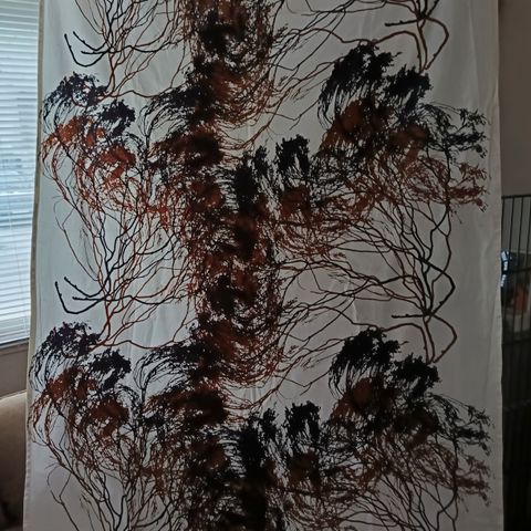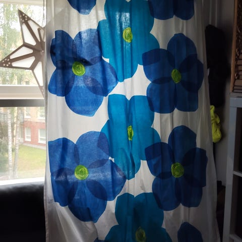 Marimekko Pippurikerä-kuosinen verho (1 kpl), L 141 cm ja K 228 cm. Kaikki sivut ommeltu. Ylhäällä ja alhaalla käänteet.