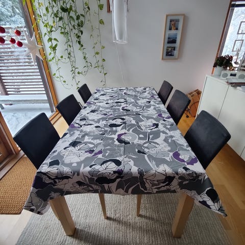 IKEA pöytäliina, jossa on vihreä, valkoinen ja musta geometrinen kuvio. Materiaali on paksua puuvillaa. Minulla tämä on ollut muutaman kerran käytössä pöytäliinana mutta siitä voi tehdä myös verhon. Liinan leveys on 148 cm ja pituus 214 cm.