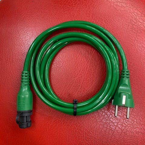 Musta normi kumikaapeli, autoon tulevassa päässä syttyy vihreä valo kun virta on päällä. 20e