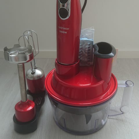 Mukana myös vispilä, taikinakoukku, sekoitin ja suojakansi.