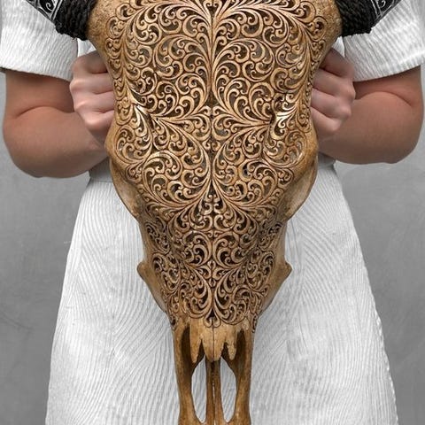 Suuri käsin kaiverrettu lehmäkallo, jonka taiteilijat ovat kaivertaneet, siirtäen muinaisen kaiverrataiteen perinnettä isältä pojalle.Kallo on kokonaan käsin veistetty suurella huolella. Se on epätavallinen, koristeellinen kappale.Kallo on kaiverrettu kauniilla pienellä lootuskukkokuvioilla.Noin mitatKorkeus: 57 cmLeveys: 46 cmHUOM:Olemme lisänneet kuvia käsityöläisistämme työssään antaaksemme kuvan siitä, millainen prosessi on kaiverratetun pään luominen.Paino, joka mainitaan, sisältää pakkausmateriaalin.VastuuvapauslausekePäähän on kiinnitetty kiristysnarusta, jotta se voidaan kiinnittää seinälle.Sarvet irrotetaan kuljetustarkoituksiin ja ne on helppo kiinnittää uudelleen. Sarvet on aina pakattu laatikon pohjalle, kallon alle. Varmistathan, että poistat sarvet ennen pakkauksen hävittämistä.- Koska kyseessä on luonnollinen kallo, siinä saattaa olla joitakin luonnollisia pieniä halkeamia, uurteita tai puuttuvia hampaita. Tämä on normaalia. Katso kuvat viitteeksi.- Kallomme puhdistetaan ammattilaisvoimin, mutta joskus hampaissa voi esiintyä pieniä värjäytymiä. Tämä on luonnollista ja normaalia, eikä siihen voida paljoa vaikuttaa. Katso kuvat.LähetysKohde lähetetään seurantanumerolla DHL Parcelin, DPD:n tai postNlin kautta. Seuranta päivittyy Catawiki-luettelossasi, kun pakettisi on jätetty postiin.Ole hyvä ja tarkista säännöllisesti välttääksesi pakettisi palautumisen meille, jolloin ostaja vastaa toisen lähetyksen toimituskuluista.Seurantaan Espanjaan ja Portugaliin käytä tätä linkkiä ja lisää Catawiki-erästäsi saatu seurantanumero.https://clientesparcel.dhl.es/LiveTracking/HomeME EMME YHDISTÄ TOIMITUKSIA!!!Jos sinulla on kysyttävää paketistasi, ota meihin yhteyttä Catawiki-viestipalvelun kautta. Pyrimme vastaamaan kolmessa työpäivässä.