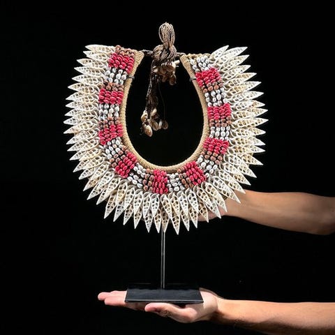 Kaunis simpukkakaulakoru mittatilaustyönä tehdyllä jalustalla Papua-Uudesta-Guineasta.Kaulakoru koostuu kauniista suurista valkoisista leikatuista simpukoista ja punaisista helmistä, jotka on käsin punottu jute-taustalevyn päälle.Noin mitat - mukaan lukien jalusta:Korkeus: 40 cmLeveys: 39 cmVastuuvapautukset:Ole hyvä ja huomioi, että nämä kuvat on otettu pimeässä studiolla, ja värit voivat vaihdella ympäristön mukaan.> MAINITTU PAINO SISÄLTÄÄ PAKKAUSMATERIAALIN.LähetysKohde lähetetään seurantanumerolla DHL Parcelin, DPD:n tai postNlin kautta. Seuranta päivittyy Catawiki-luettelossasi, kun pakettisi on jätetty postiin.Ole hyvä ja tarkista säännöllisesti välttääksesi pakettisi palautumisen meille, jolloin ostaja vastaa toisen lähetyksen toimituskuluista.Seurantaan Espanjaan ja Portugaliin käytä tätä linkkiä ja lisää Catawiki-erästäsi saatu seurantanumero.https://clientesparcel.dhl.es/LiveTracking/HomeEMME YHDISTÄ TOIMITUKSIA!!!- Jos sinulla on kysyttävää paketistasi, ota yhteyttä meihin Catawiki-viestipalvelun kautta. Yritämme vastata kolmen työpäivän kuluessa.