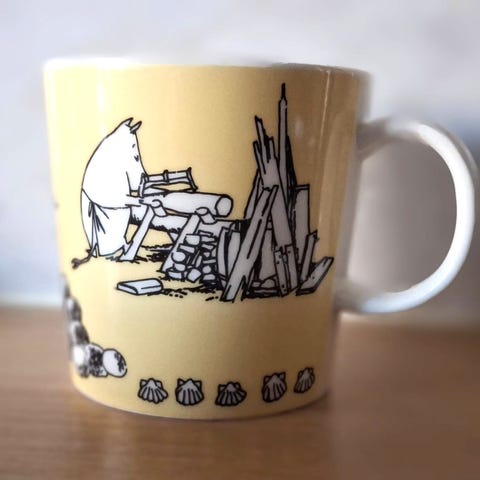 Hyväkuntoinen Muumit eväsretkellä settiin kuuluva muumimuki (valmistetty 1990-1994).
