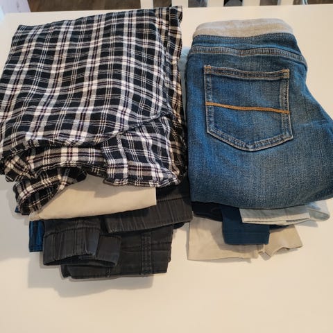 Tässä kivoja pitkä- ja lyhythihaisia, ohuita ja paksuja paitoja, kahdet shortsit ja yksi yöpuku. Housuja ei tämä setti sisällä (lukuun ottamatta pyjamahousut), koska niissä aina polven kohdalta kangas kuluu niin paljon käytössä tän ikäisillä pojilla.. Meillä eläimetön, savuton ja hajusteeton koti.