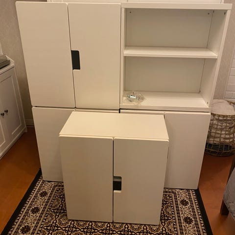Kaksi vetolaatikkoa. Yksi kaappi. Kaksi lokeroa. Alla lukkiutuvat renkaat.