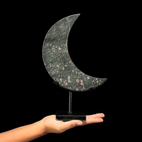 Kaunis kiillotettu puolikuu, joka on valmistettu rubiinista zoisiittinä, räätälöidyllä jalustalla.Ruby Zoisite tunnetaan myös nimellä Ruby in Zoisite tai Anyolite. Se on kivi, joka on erinomainen yhdistelmä energiaa ja väriä, tehden siitä yhden jaloimmista ja upeimmista kivistä kaikista kivistä.Anyolite on nimi, joka kuvaa luonnollista yhdistelmää vihreästä Zoisite-kivestä ja rubiini-kivestä.Zoisite on kirkas keskivihreä, jonka näet kiven sisällä, ja se yhdistyy täydellisesti Ruby-kiven syvän magentanpunaisen kanssa.Noin mitat mukaan lukien jalustaKorkeus : 28,8 cmLeveys : 18 cmVastuuvapautukset:Ole hyvä ja huomaa, että nämä kuvat on otettu hämärässä studiosta, ja värit voivat vaihdella ympäristön mukaan.Paino, joka mainitaan, sisältää pakkausmateriaalin.LähetysKohde lähetetään seurantanumerolla DHL Parcelin, DPD:n tai postNlin kautta. Seuranta päivittyy Catawiki-luettelossasi, kun pakettisi on jätetty postiin.Ole hyvä ja tarkista säännöllisesti välttääksesi pakettisi palautumisen meille, jolloin ostaja vastaa toisen lähetyksen toimituskuluista.Seurantaan Espanjaan ja Portugaliin käytä tätä linkkiä ja lisää Catawiki-erästäsi saatu seurantanumero.https://clientesparcel.dhl.es/LiveTracking/HomeME EMME YHDISTÄ TOIMITUKSIA!!!Jos sinulla on kysyttävää paketistasi, ota meihin yhteyttä Catawiki-viestipalvelun kautta. Pyrimme vastaamaan kolmessa työpäivässä.