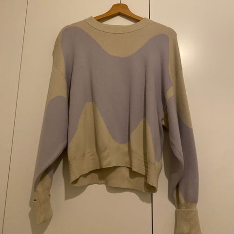 Marimekon Tikru Lokki-neule. Väri haalean liila/luonnonvalkoinen. Koiratalous.