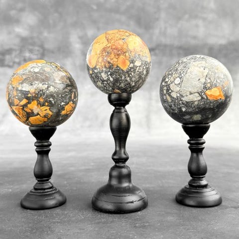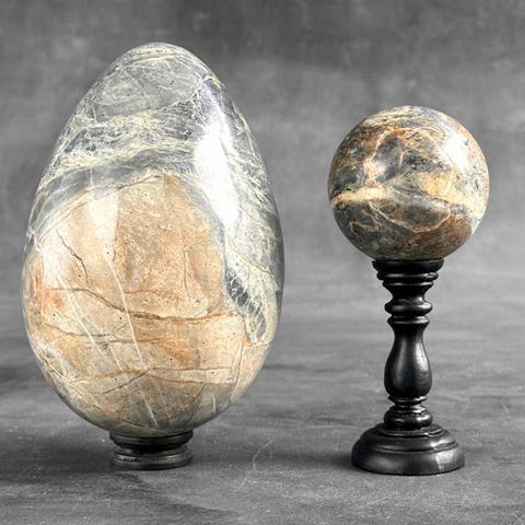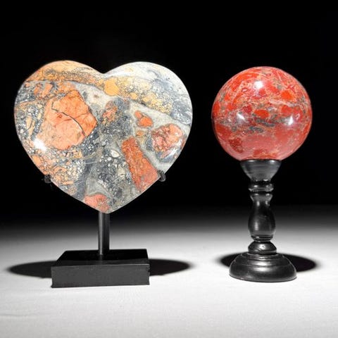 Upea pari Maligano-jasperi-palloja ja karkeita punajaspikokoja räätälöidyllä jalustalla.Maligano jasper on tietty tyyppi jaspista, jota esiintyy Indonesiassa, ja se muodostuu muinaisten tulivuoren kuumavesilähteiden alueilla. Maligano tunnetaan kontrastisista lämpimistä sävyistään sinisten ja harmaiden sävyjen päällä, sekä upeista brecciated- eli rikkoutuneista ja parantuneista kuvioistaan, sekä hauskoista dendriittikuviostaan, jotka usein esittävät jokimaisemia pienten pensaiden kanssa vierivieressä solisevan joen äärellä.Punainen jaspis on jaspiksen eräänlainen muoto, joka on opakea chalcedony-tyyppi. Se on tunnusomaista punaisesta väristään, joka voi vaihdella syvästä tiilenpunaisesta vaaleampaan ruosteiseen sävyyn. Kuten muutkin jaspiksen muodot, punainen jaspis koostuu pääasiassa piidioksidista (SiO2) ja sisältää usein muita mineraaleja tai epäpuhtauksia, jotka vaikuttavat sen ainutlaatuiseen väritykseen.Noin mitat - mukaan lukien jalusta.# Maligano jasper Sphere 1 --> Korkeus: 19,2 cm Läpimitta: 10,4 cm# Punainen jasperipallo 2 --> Korkeus: 14,9 cm Halkaisija: 7,4 cmVastuuvapautukset:Ole hyvä ja huomioi, että nämä kuvat on otettu pimeässä studiolla, ja värit voivat vaihdella ympäristön mukaan.> MAINITTU PAINO SISÄLTÄÄ PAKKAUSMATERIAALIN.LähetysKohde lähetetään seurantanumerolla DHL Parcelin, DPD:n tai postNlin kautta. Seuranta päivittyy Catawiki-luettelossasi, kun pakettisi on jätetty postiin.Ole hyvä ja tarkista säännöllisesti välttääksesi pakettisi palautumisen meille, jolloin ostaja vastaa toisen lähetyksen toimituskuluista.Seurantaan Espanjaan ja Portugaliin käytä tätä linkkiä ja lisää Catawiki-erästäsi saatu seurantanumero.https://clientesparcel.dhl.es/LiveTracking/HomeME EMME YHDISTÄ TOIMITUKSIA!!!Jos sinulla on kysyttävää paketistasi, ota meihin yhteyttä Catawiki-viestipalvelun kautta. Pyrimme vastaamaan kolmessa työpäivässä.