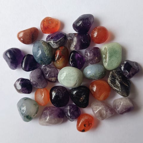 20 kpl puolijalokiviä; sininen aventuriini, kalcedoni, karneoli, sammalakaatti (milky), ametisti.