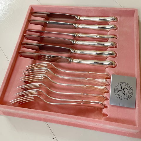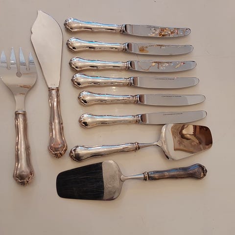 Ruokahaarukat ja veitset. Hopeasetti 12-osaa, vähän käytetty, hyvässä kunnossa. Kotimaiset leimat. Hopeapitoisuus 830, vuosileima U7 (1973). Pituus haarukat 18 cm, veitset 21 cm. Kokonaispaino 632 g. Veitsen terä terästä. Kaiverrus Enni. Voin postittaa (n. 10 e).