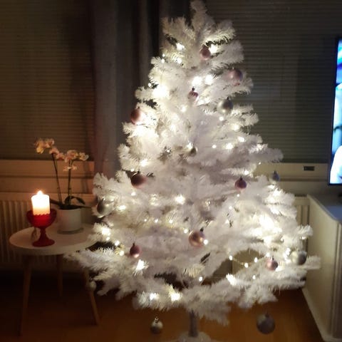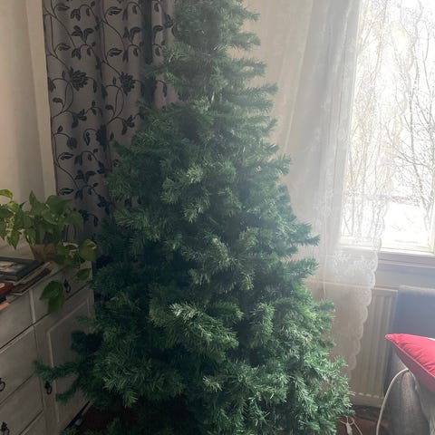 Ihana pitkä joulukuusi 3- osasta +violetteja joulupalloja mukaan. Makana on pahvipaketti