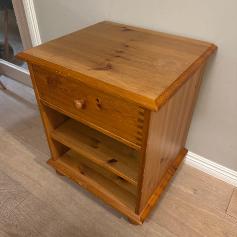 Puinen yöpöytä. Normaalia kulumaa.
