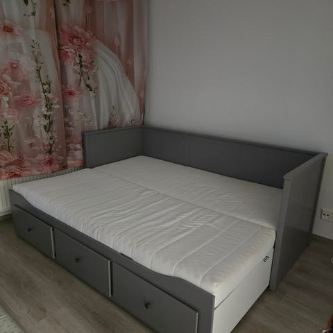 Levitettävä vuodesohva. Kasassa 80x200 cm patja ja auki 2×80×200 cm. Vuodesohvassa on isot alalaatikot, jonne saa tyynyt, peitot ja muut talteen. Pinnassa on pieniä naarmuja/käytön jälkiä, mutta yleisilme siisti. Rimat ehjät ja siistit. Tukeva ja kestävä. Sopii esim. varasängyksi, vierassängyksi ym. Hinta uutena patjoineen 509 euroa.