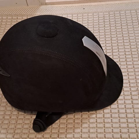 Wembleyn siisti musta ja "samettinen" kypärä. Peräisin kirpparilta. Itse olen käyttänyt muutaman kerran, eikä ole kolhiintunut tms. Minun päähän ei aivan sopivan mallinen.
