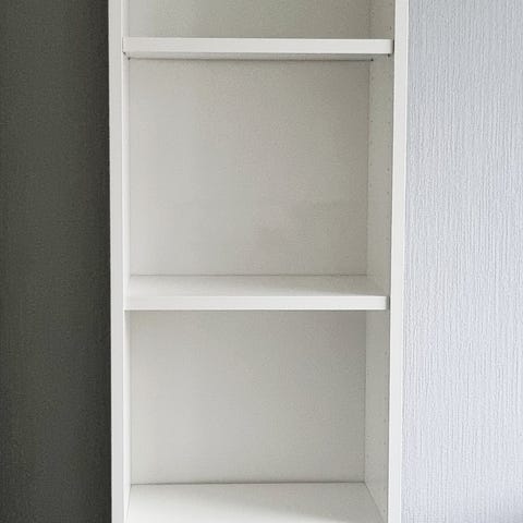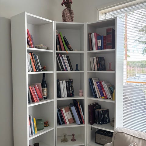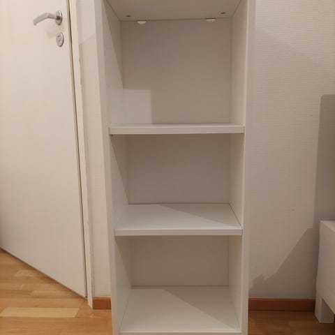 Valkoinen Ikean Billy-hylly. Tässä taitaa olla yksi ylimääräinen hyllylevy.