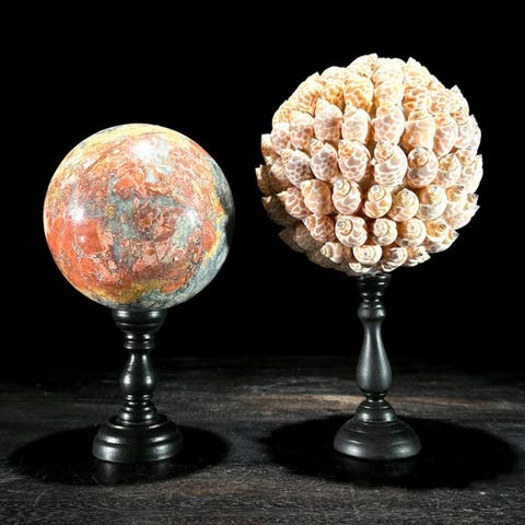 Upea pari: simpukkapallokoriste ja onyx-pallo telineillä.Tämä kaunis kuoripallo, näiden käsintehtyjen pallojen yksinkertaiset tekstuuriset muodot lisäävät luonnollisen ilmeen mihin tahansa ympäristöön. Jokainen on koristeellinen pallo eri kokoisina ja kuvioina, täysin pienistä kuorista peitettynä. Luonnollinen ja neutraali sävyltään, boho- ja ranta-tyyliin sopiva.Nämä on valmistettu sadoista luonnollisista simpukoista, jotka on käsin aseteltu. On normaalia löytää satunnaisesti puuttuva simpukka. Odota myös pieniä virheitä ja värivaihteluita.Onyx on jalokivi, joka kuuluu kvartsin kryptokristalliseen muotoon. Se muodostuu tyypillisesti magmakivien, erityisesti tulivuoren laavavirtojen, onkaloihin, joissa silikaerikkaita nesteitä kerrostuu ajan myötä kvartsikerroksiksi. Tämä prosessi luo onyxin tunnusomaisen raidallisen ulkonäön, jossa on vuorottelevia väriraitoja. Vaikka mustavalkoinen raidallinen onyx on yleisin, sitä voi esiintyä myös ruskean, punaisen, vihreän tai muiden värien sävyissä.Onyxin tunnusmerkkejä ovat sen hieno rakenne ja kiiltävä, kiillotettu pinta. Sillä on sileä tuntu, ja se osoittaa usein korkeaa läpinäkyvyyttä, kun se on asianmukaisesti leikattu ja kiillotettu. Onyxin raidat voivat vaihdella paksuudeltaan ja järjestykseltään, vaihdellen suorista ja tasaisista epäsäännöllisiin ja aaltoileviin, riippuen muodostumisolosuhteista.Noin mitat, mukaan lukien jalusta.- Shel Ball : Korkeus : 21 cm Halkaisija: 10 cm- Onyx Sphere : Korkeus: 18,8 cm, Läpimitta : 10,1 cmVastuunvapaus- Tarkista paikallisilta määräyksiltä ja viranomaisilta, onko tämän tuotteen tuominen maahan sallittua, ennen tarjouksen tekemistä.Se on luonnontuote, pieniä halkeamia tai virheitä voi esiintyä. Ole hyvä ja katso kuvia.Ole hyvä ja huomaa, että nämä kuvat on otettu hämärässä studiosta, ja värit voivat vaihdella ympäristön mukaan.Yksi tai useampi kuva esittää tyyliteltyä esinettä. Tarkat tiedot myytävästä esineestä löytyvät muista kuvista. Tyylitellyssä kuvassa olevat esineet eivät sisälly myyntiin.Paino, joka mainitaan, sisältää pakkausmateriaalin.LähetysKohde lähetetään seurantanumerolla DHL Parcelin, DPD:n tai postNlin kautta. Seuranta päivittyy Catawiki-luettelossasi, kun pakettisi on jätetty postiin.Ole hyvä ja tarkista säännöllisesti välttääksesi pakettisi palautumisen meille, jolloin ostaja vastaa toisen lähetyksen toimituskuluista.Seurantaan Espanjaan ja Portugaliin käytä tätä linkkiä ja lisää Catawiki-erästäsi saatu seurantanumero.https://clientesparcel.dhl.es/LiveTracking/HomeEMME YHDISTÄ TOIMITUKSIA!!!- Jos sinulla on kysyttävää paketistasi, ota yhteyttä meihin Catawiki-viestipalvelun kautta. Yritämme vastata kolmen työpäivän kuluessa.