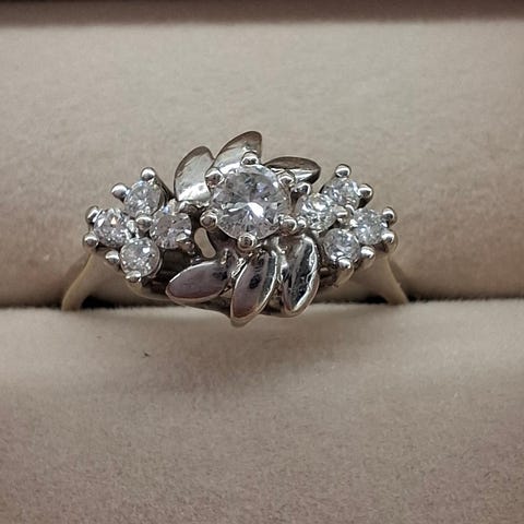 Kohinoor timanttisormus valkokultaa. Timantit 0.20. Koko 18.5. Mustia ja kirkkaita timantteja.