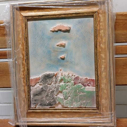 Arvo Siikamäki 1943-2026 "Merkkejä taivaalla" betonireliefi sig. mittoja kehysten päältä korkeus n.45cm leveys n.38cm kuva-ala n.33x25cm
