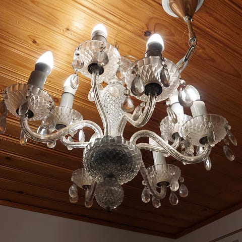 Kristallikruunu, jossa on kahdeksan valopistettä ja koristeellisia lasiriipuksia. Valmistaja on Cristalstrass Maria Theresa. Tyyli on klassinen Maria Theresa, joka tunnetaan koristeellisista ja ylellisistä muodoistaan. Tämä tyyli on saanut vaikutteita barokin ja rokokoon aikakausilta.