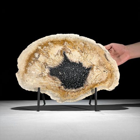 Upea kivettyneen puun viipale räätälöidyllä jalustalla.Kivettynyt puu on mineraalisoitunut kappale puusta, joka on muodostunut, koska puut kaatuivat ja peittyivät maaperän tai hiekan kerrokseen. Usein tämä tapahtuu luonnonkatastrofin seurauksena. Kivettyneen puun värit riippuvat maaperän tai hiekan mineraaleista. Jokainen mineraali luo oman värinsä. 'Kivettyminen'-prosessi varmistaa, että kaikki ominaisuudet, kuten solmut, kuori ja vuosirenkaat, säilyvät. Mahdollisesti hajoava prosessi kaukaisessa menneisyydessä voi johtaa upeisiin kristallimuodostelmiin, usein monivärisinä.Noinmiten mitat - jalustan kanssaKorkeus: 24,5 cm - Leveys: 29 cm - Viipaleen paksuus: 1,7 cmNoin mitat ilman jalustaa.Korkeus: 19,5 cm - Leveys: 29 cm - Viipaleen paksuus: 1,7 cmVastuuvapautukset:- Olkaa tietoisia siitä, että yksi tuotteista on otettu pimeässä studiossa; värit voivat vaihdella ympäristön mukaan.Paino, joka mainitaan, sisältää pakkausmateriaalin.LähetysKohde lähetetään seurantanumerolla DHL Parcelin, DPD:n tai postNlin kautta. Seuranta päivittyy Catawiki-luettelossasi, kun pakettisi on jätetty postiin.Ole hyvä ja tarkista säännöllisesti välttääksesi pakettisi palautumisen meille, jolloin ostaja vastaa toisen lähetyksen toimituskuluista.Seurantaan Espanjaan ja Portugaliin käytä tätä linkkiä ja lisää Catawiki-erästäsi saatu seurantanumero.https://clientesparcel.dhl.es/LiveTracking/HomeME EMME YHDISTÄ TOIMITUKSIA!!!Jos sinulla on kysyttävää paketistasi, ota meihin yhteyttä Catawiki-viestipalvelun kautta. Pyrimme vastaamaan kolmessa työpäivässä.