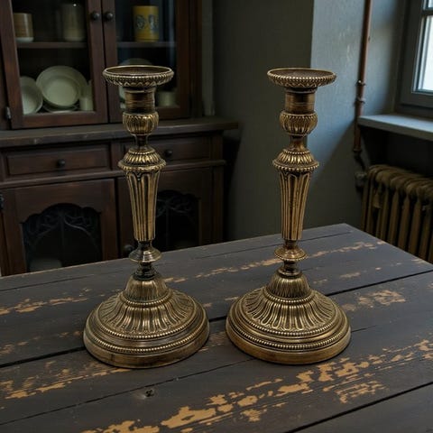 Pari barokkityylisiä kynttelikköjä, sorvattua pronssia, XVIII–XIX vuosisatoja.Loistava pari kultauksella viimeisteltyjä pronssikyntteliköitä, ajoittuen 1700-luvun lopusta 1800-luvun alkuun, jotka taitavasti ilmentävät myöhäisbarokin runsasta ja teatraalista estetiikkaa. Jokainen kappale nousee porrastetun, pyöreän pohjan päällä, jossa on herkkiä samankeskisiä renkaita, jotka antavat visuaalisen tasapainon ja rakenteellisen vakauden. Varsi, hoikka ja rikkaasti sorvattu, esittelee sarjan pallomaisia muotoja, uurteita ja aaltoilevia profiileja, jotka herättävät liikkeen ja aikakauden ominaiseen vaurautta kuvaavan ylellisyyden.Yläkupin kellomaisen muodon ansiosta se on suunniteltu ottamaan vastaan ohuita kynttilöitä, ja se säilyttää lämpimän patinan, joka korostaa pronssin arvokkuutta ja sen elävää historiaa. Pinta heijastaa tyylikkäästi valoa, luoden kimalluksen leikkejä, jotka korostavat sen läsnäoloa missä tahansa tilassa.Nämä esineet eivät ole pelkästään koriste- tai valaistusfunktion täyttäjiä, vaan ne ovat aikakauden todistuksia, jolloin koristelu oli statuksen ja hienostuneisuuden ilmentymä. Ihanteellisia koristamaan konsolea, takkaa tai sohvapöytää, ne tuovat sisätiloihin luonnetta ja aitoutta klassisiin, eklektisiin tai jopa nykyaikaisiin tiloihin, jotka arvostavat menneisyyden ja nykyisyyden välistä vuoropuhelua.Poikkeuksellinen tilaisuus hankkia esineitä, joilla on sielu, historia ja veistoksellinen kauneus.Sertifioitu lähetys ja hyvä pakkaus.