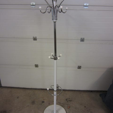 Valkoinen naulakko, jossa on useita koukkuja vaatteiden ripustamiseen. Kolmijalkainen rakenne tarjoaa vakautta.