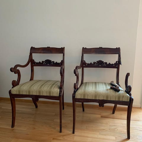 Toisessa tuolissa on pieni tahra istuimessa. Muuten tuolit ovat hyvässä kunnossa.
