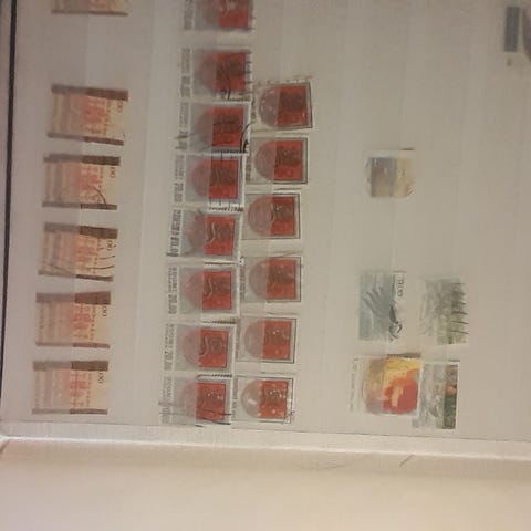 Postimerkkikansio. kork. 22 cm lev. 16 cm. sivuja 16 merkit ovat leimattuja. Kansiosta noin puolet Suomalaisia ja toiset Ulkolaisia. Osa Suomalaisista merkeistä vähän vanhempia. Nouto.