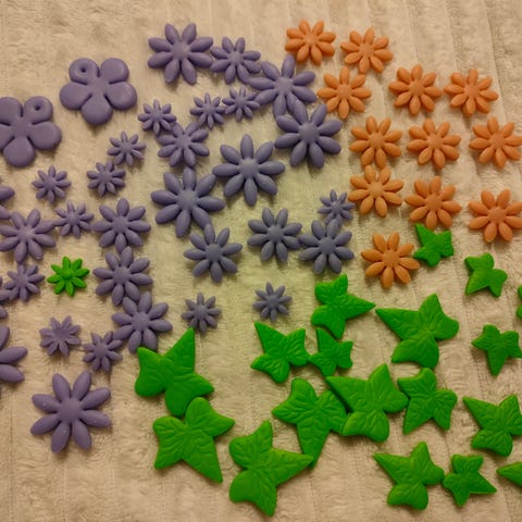 Noin 70 kpl huopakukkasia ja kartonkikukkasia askarteluun. Koko noin 3-5 cm. Itsetehtyjä.