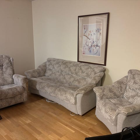 Myydään Askosta ostettu punakankainen sohva ja samaa kangasta olevat 2 nojatuolia.