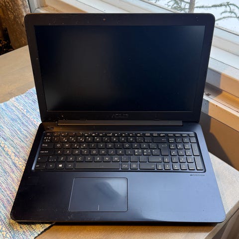 Asus R541U kannettava tietokone, jossa on Intel-i5 prosessori. Kuvassa myös muuta tietoa koneesta. Akku ilmeisesti melko tiensä päässä, mutta pelaa laturissa ok.