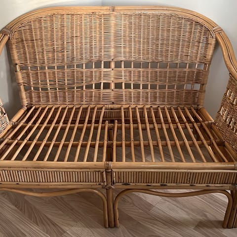 Myydään 2 istuttava rottinkisohva pehmusteilla. Sohvaa säilytetty pääosin lasitetulla parvekkeella viltin alla. Sohvan istuinosa ei ole irroitettava. Sohvatyynyissä pientä likaa, saattaa lähteä oikeilla aineilla ja pesulla pois. Lisäksi rungossa mustia likakohtia, jotka eivät lähteneet vedellä pyyhkimällä pois. Sohva muuten täysin ehjä ja hyvässä kunnossa. Sohva ei haise. Savuton ja eläimetön talous.