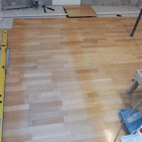 Hakusessa pieni määrä (alle 2 neliömetriä) puuvalmista/käsittelemätöntä parkettia. Kunnolla ei väliä, tulee maalattavaksi.