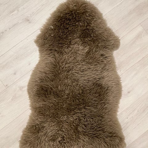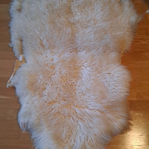 Hoitamaton lampaantalja. Vaatii pesua. Nahka on kovettunutta. Ollut tuolin suojana.