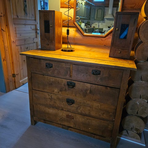 Kaunis senkki, jossa kansi puuta. Runko metallinen. Kaksi ulos vedettävää laatikkoa.