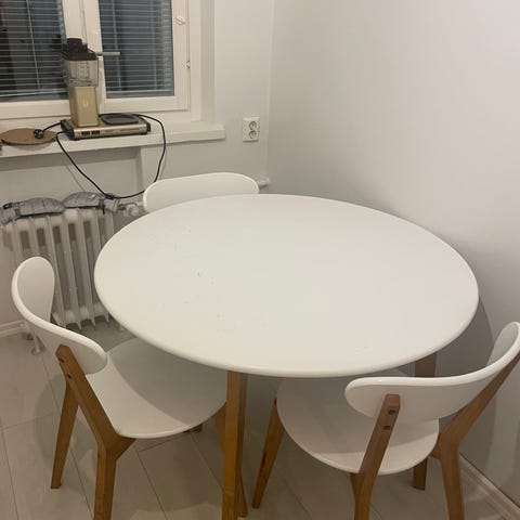 Myydään pyöreä valkoinen ruokapöytä puujaloilla. Pöydän kannen halkaisija 105cm. Pöydän kannessa on joitakin pieniä käytön jälkiä. Pöytä on purettuna.