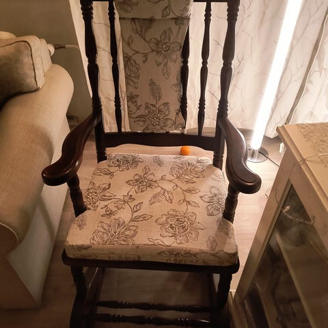 Vanha keinutuoli mustaksi maalattua puuta. Keinutuolissa on selkänoja ja käsinojat.