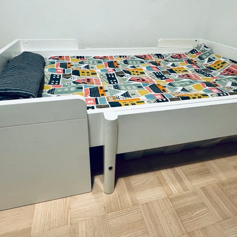 Muuramen Jolla jatkettava sänky + Lippo-säilytyslaatikko. Sängyn pituuden säätö 135-208 cm. Sopii myös kerrossängyn alasängyksi. Jonkun verran käytön jälkiä ja pari ruuvia puuttuu (ei vaikuta käyttöön). Sininen sivulaita löytyy myös, tulee mukaan.