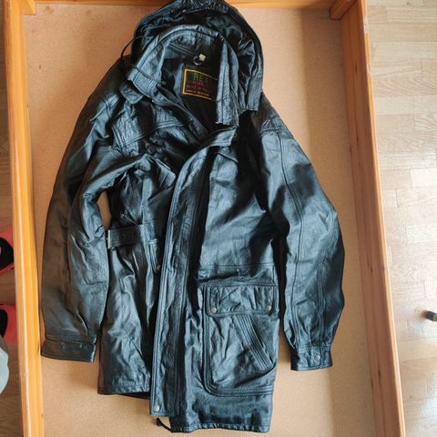 Pehmeää nahkaa. Lyhyt ja melko kapea malli. Kainalomitta 56cm, kapeat hihat. Vastaa enempi kokoa XL.